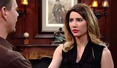 At Forrester, in Steffy's office, Thomas and Steffy discussed one of Thomas' designs, but Steffy wasn't going to fall for Thomas' trying to get her to sell it to their dad. Steffy challenged Thomas to tell her that he had made good on his bet from the previous evening. Thomas was silent.