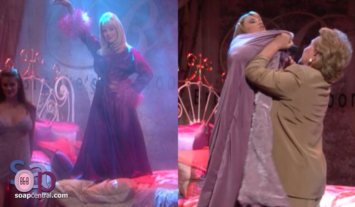 To the press, Stephanie declared that Brooke's Bedroom was a unique product mix but that they would probably be changing the name. Before she could go on, the house lights went down, and Right Said Fred's "I'm Too Sexy" began blaring over the loudspeakers. The Forresters were puzzled. Then, Megan announced over the P.A. that they were proud to present the newest of the new in pleasure design. A sextet of sultry models sauntered in, flashing lingerie and flirting with the appreciative, applauding audience. They strutted up to the stage, then a circular platform began to turn, and Megan trumpeted the woman behind Brooke's Bedroom, "the final word in sexy sophistication...Brooke Logan!" The platform revealed Brooke standing on a huge bed, wearing a long, crimson robe. "Tell me this is not happening!" Stephanie said as the crowd went wild. Ridge looked more entertained than anything else. Meanwhile, Taylor gaped at her TV, unable to believe what she was seeing.