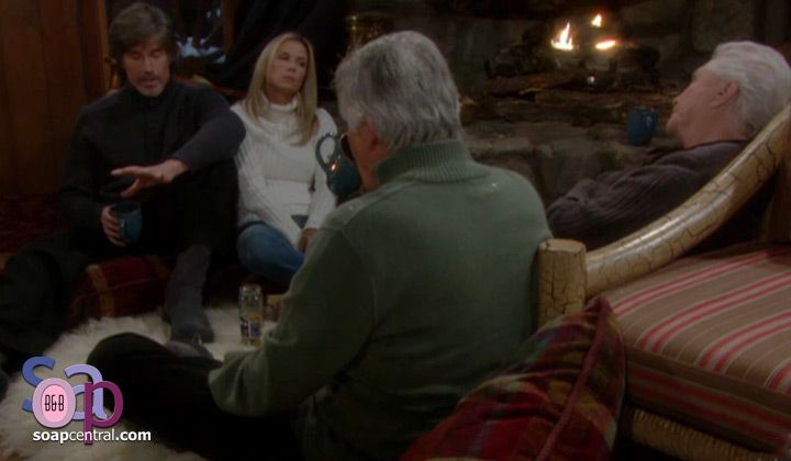"All right. I'm in," Ridge relented. Everyone cheered, and Brooke told Stephanie that it was the four of them from the beginning to the bitter end. "Happy five thousand!" Ridge exclaimed and hugged Eric. Brooke asked Stephanie for a hug, but Stephanie decided she'd wait until ten thousand. Brooke told Ridge that she'd see him in the bedroom, and Stephanie snapped that some things never changed. Stephanie tensed when Brooke slipped up from behind, drew her arms around the seated Stephanie, and whispered, "I know you love me." Stephanie cringed as Brooke kissed her cheek.