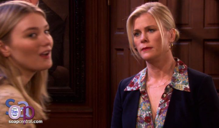 "You don't know what [Allie] will do. The last time you cornered her, what happened? She took off, and she left a letter saying that she wanted Nicole and Eric to raise her baby," Kate said. Frustrated, Sami said she needed to stop Allie. Sami asked Kate for help. Kate argued that Allie was likely already talking to Nicole and Eric. Kate noted that Allie could convince the judge to take the baby from Sami regardless.
