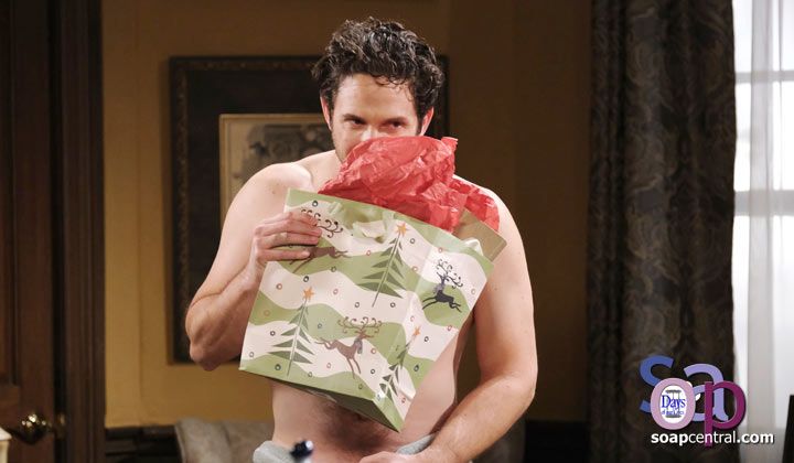 Kate sneaked into Jake's room at the DiMera mansion to leave a present on his bed, but she was interrupted when Jake exited the bathroom in a towel. "Ho, ho, ho," Jake said with a chuckle. "I didn't think you were going to be in here," Kate said. Kate explained that she had not wanted to give Jake a present in front of anyone in the house.