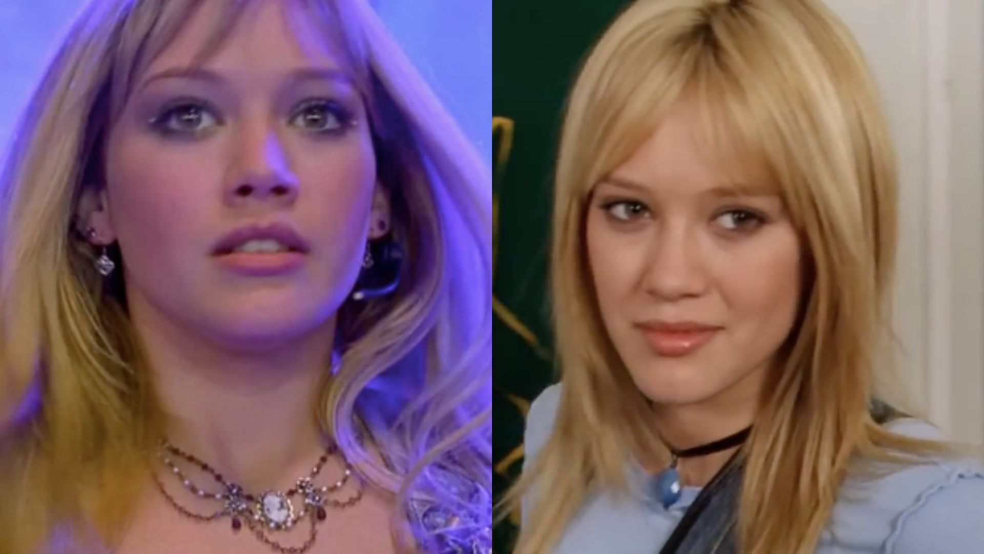 This is a collage of the stills of Hilary Duff in The Lizzie McGuire Movie (left) and A Cinderella Story (right)