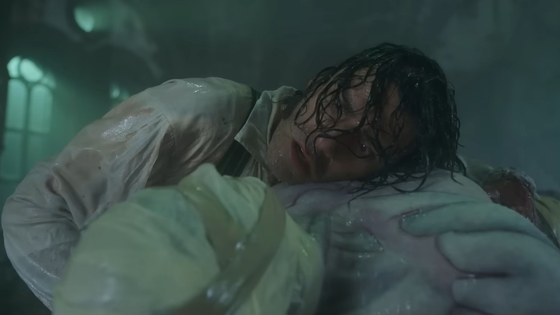 Victor Frankenstein (Oscar Isaac) appears to be listening to the heartbeat of the creature wrapped in bandages