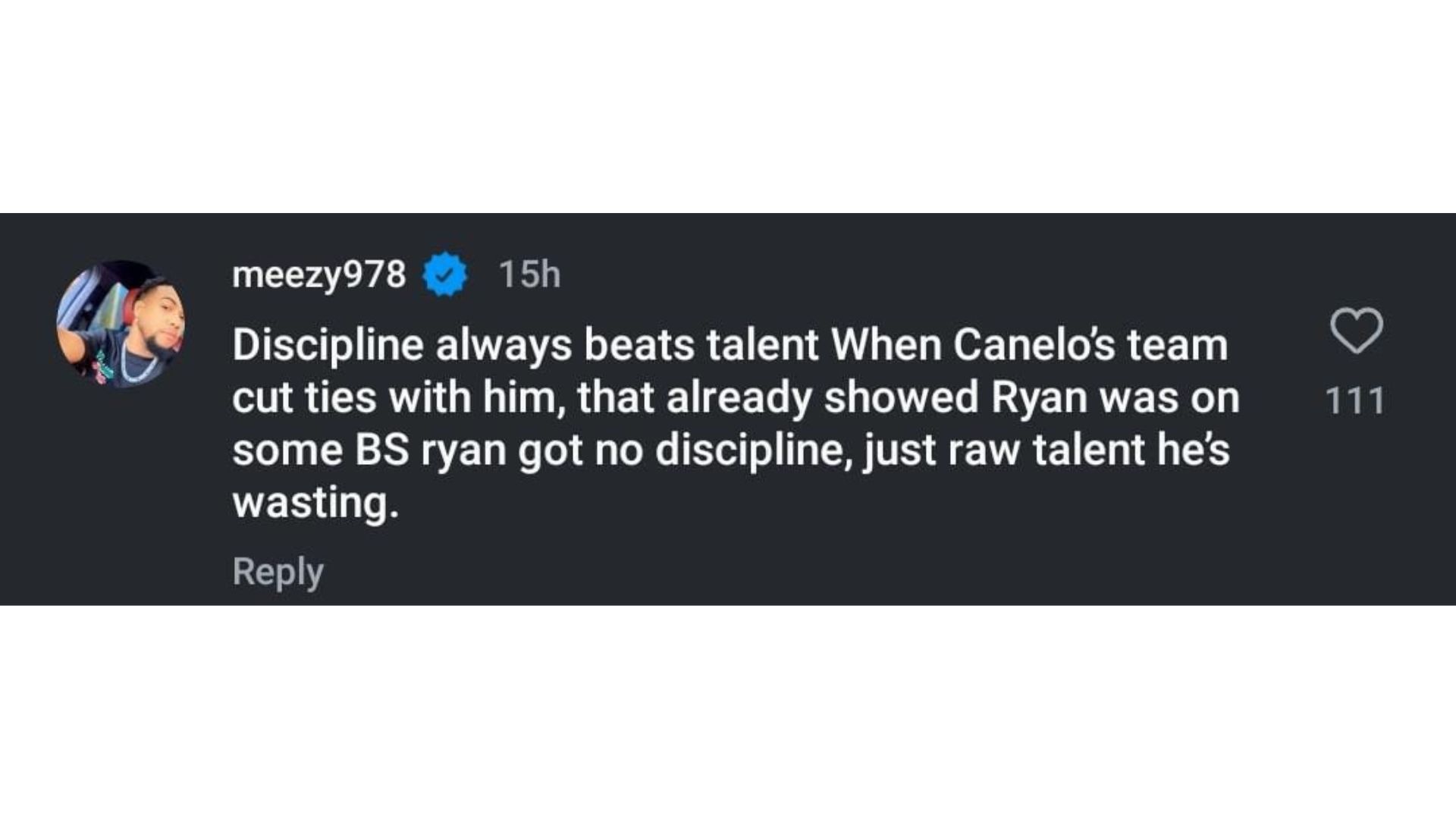 "Discipline awalys beats talent. When Canelo's team cut ties with him, that aldready showed Ryan was kn some BS Ryan got no discipline, just saw talent hey wasting."