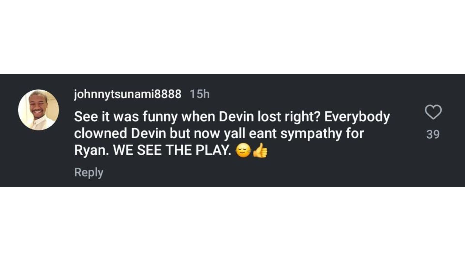 "Yes it was. Funny when Devin lost right? Everybody clowned Devin but now y'all want sympathy for Ryan. WE SEE THE PLAY."