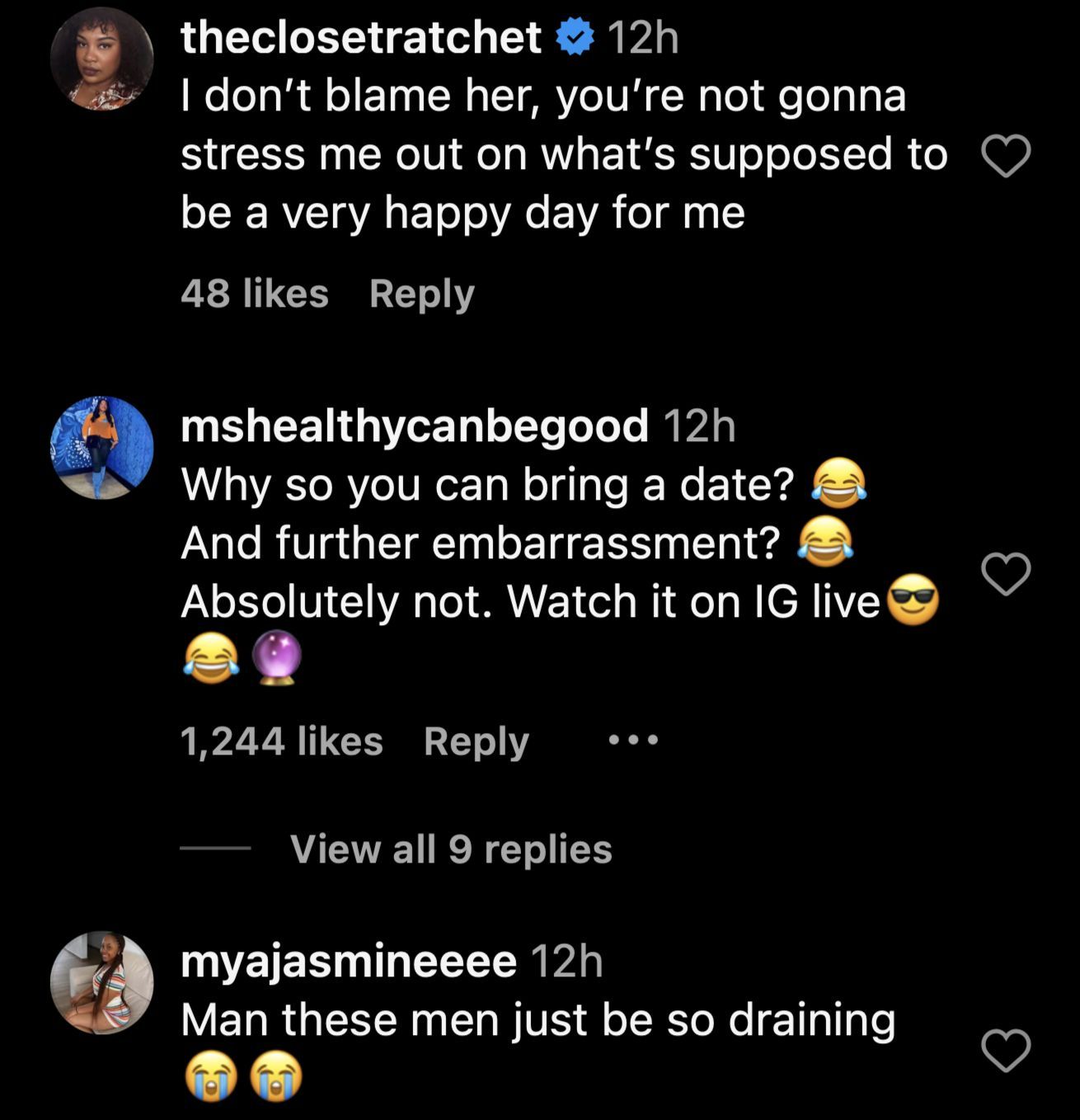 "Why so you can bring a date? 😂 And further embarrassment? 😂 Absolutely not. Watch it on IG live😎😂🔮," another suggested.