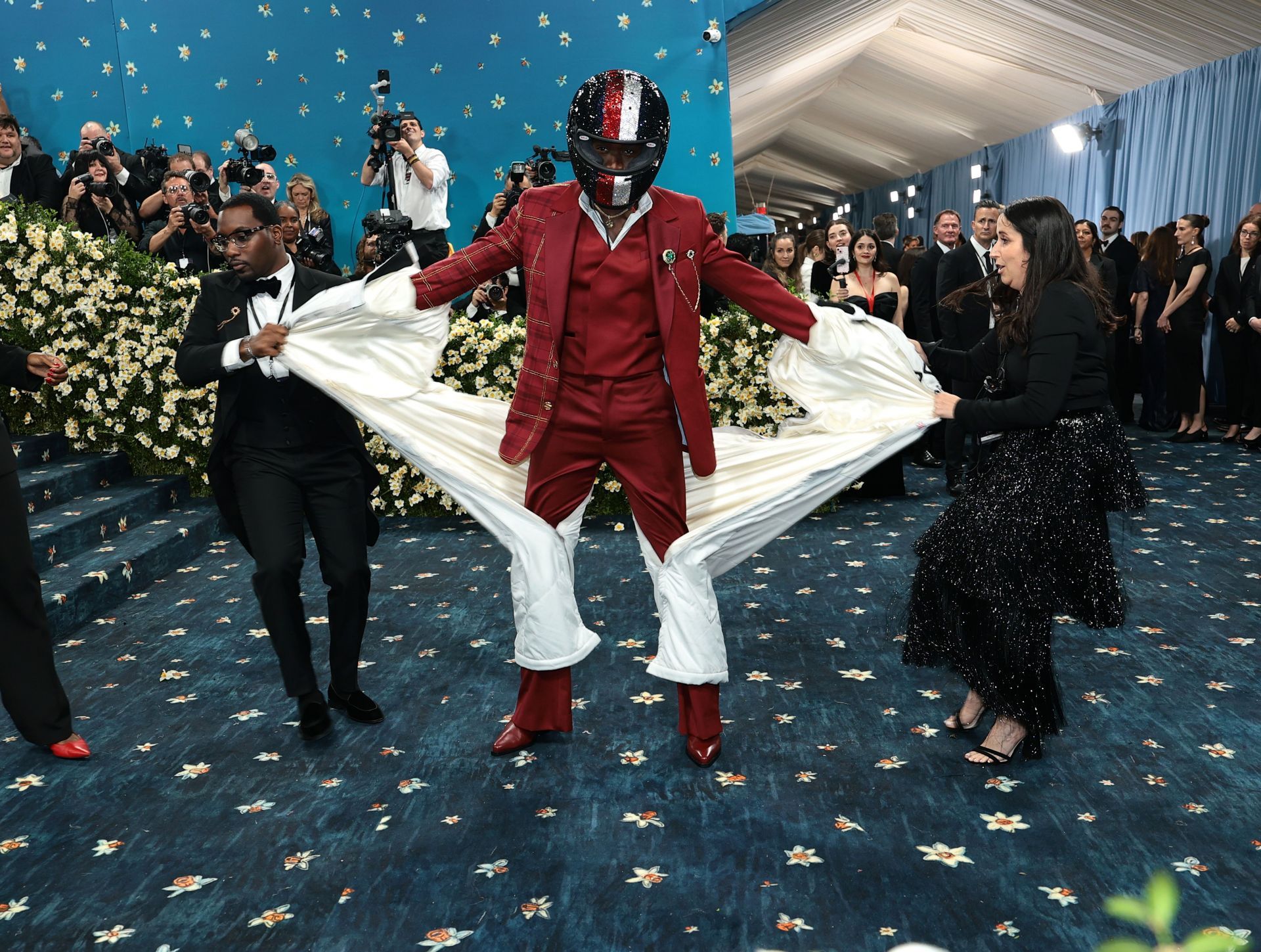 Idris' look was an ode to his upcoming film, F1. For the gala, he wore a custom Tommy Hilfiger racing suit. He complemented his couture with a shining blue, red, and white-colored helmet. Over 20,000 Swarovski crystals were used for the OTT accessory.