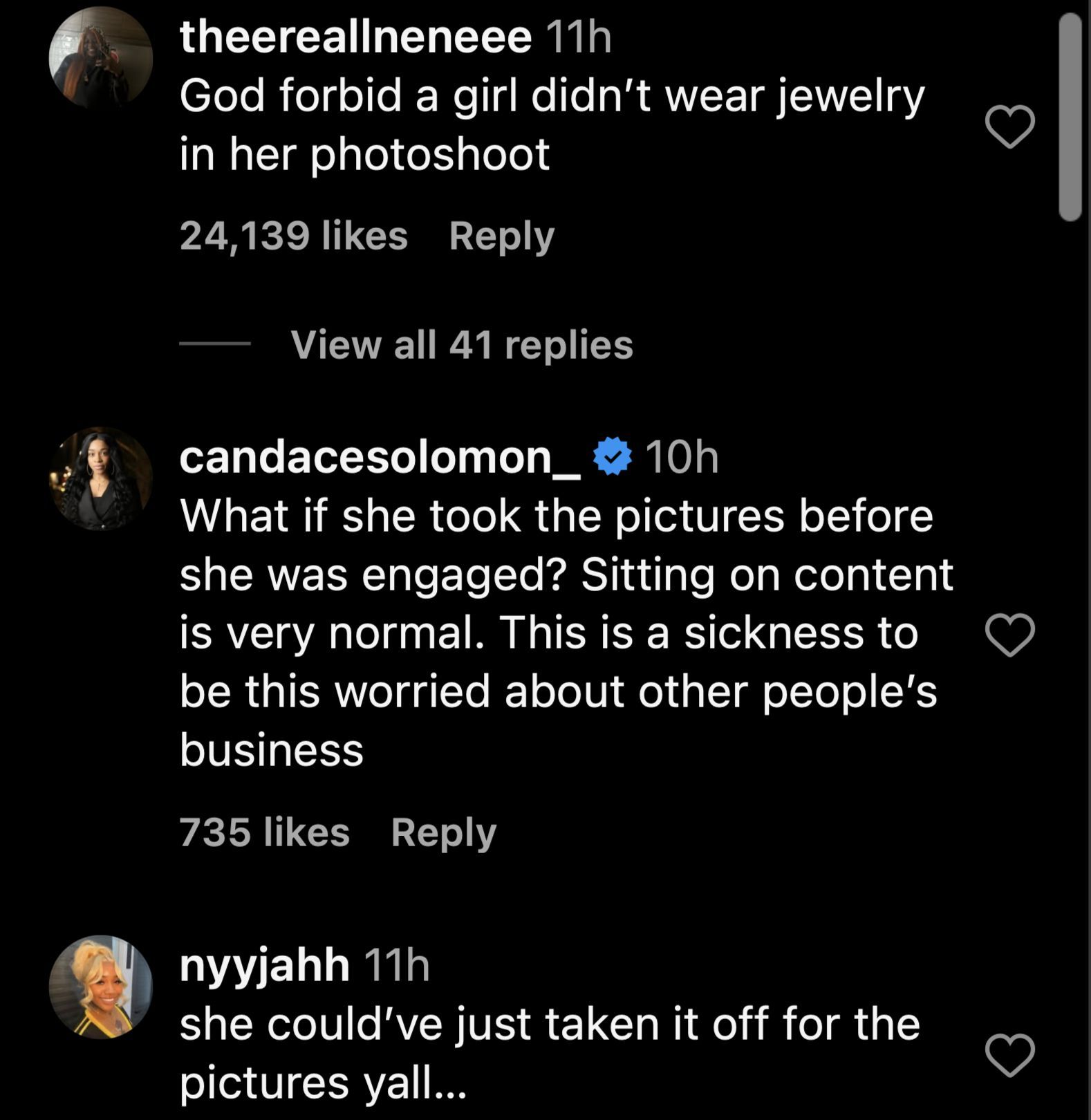 "Or hear me out maybe she just didn’t wanna wear the ring for the photo shoot! Y’all be doing so much 😂," another echoed.
