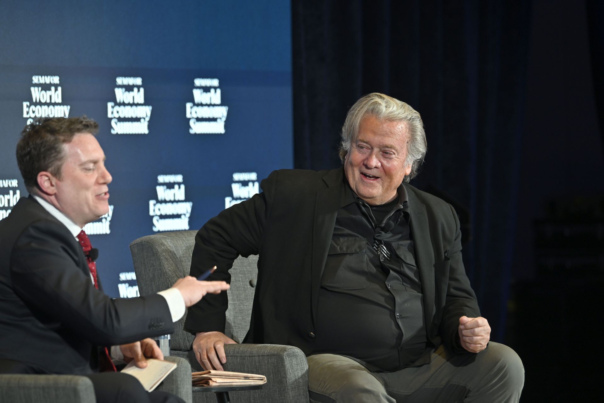 Ben Smith, Co-Founder and Editor-in-Chief of Semafor, and Steve Bannon, Chief Strategist to the 45th President, speak on stage during Day 1 of the Semafor 2025 World Economy Summit at Conrad Washington in Washington, DC, on April 23, 2025. (Image via Getty/Shannon Finney)