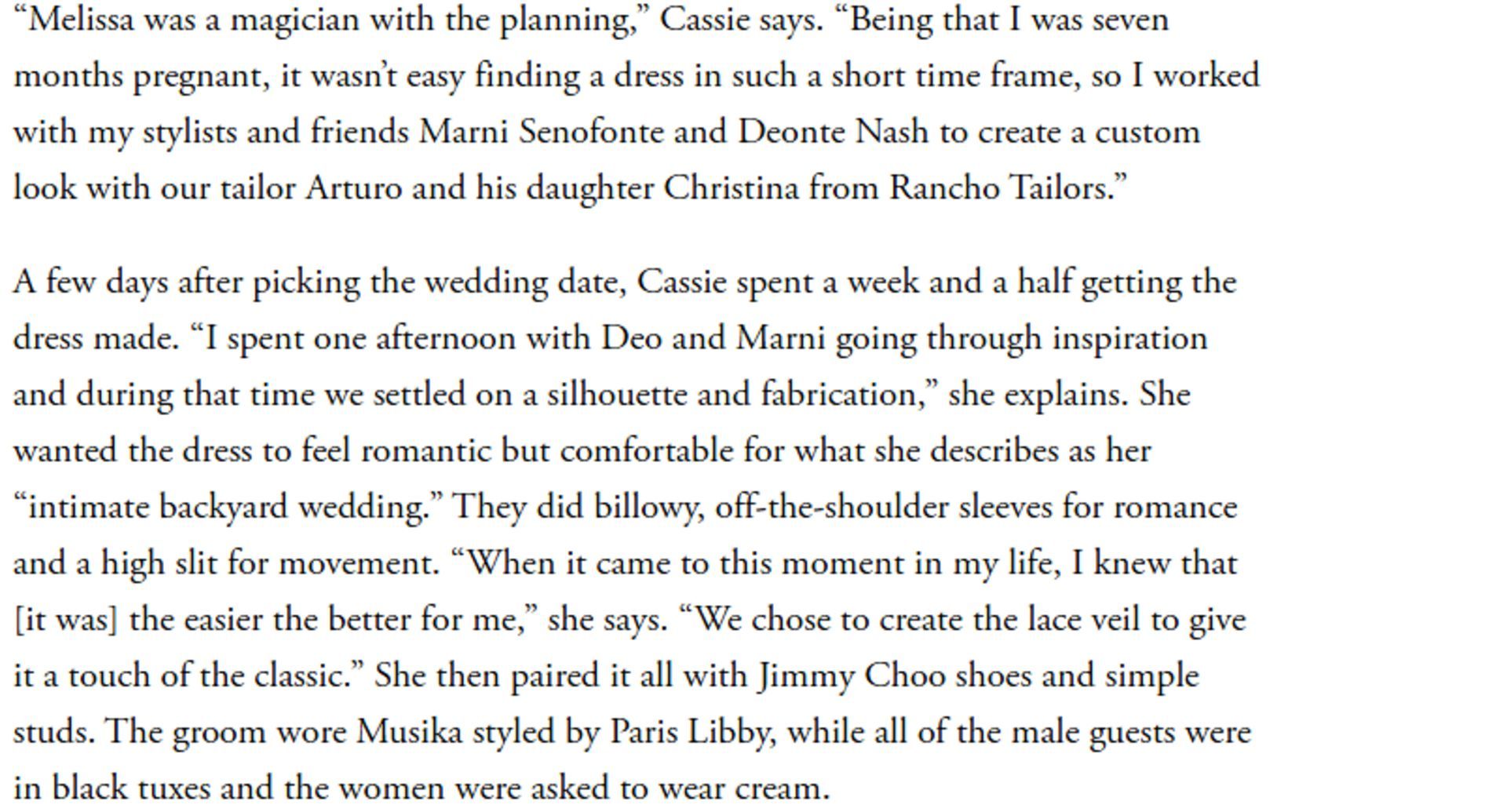"Melissa was a magician with the planning. Being that I was seven months pregnant, it wasn’t easy finding a dress in such a short time frame, so I worked with my stylists and friends Marni Senofonte and Deonte Nash to create a custom look with our tailor Arturo and his daughter Christina from Rancho Tailors."