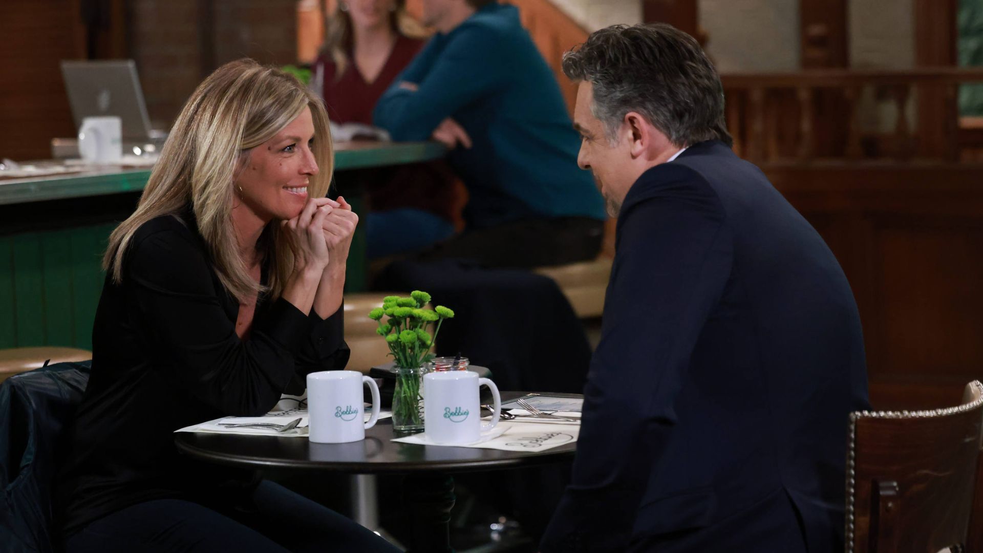 After sharing some first kisses in Germany, Carly (Laura Wright) and Jack (Chris McKenna) shared their first date at the Brown Dog bar, where Lucas and Maxie gawked and added their two cents to the new romance.