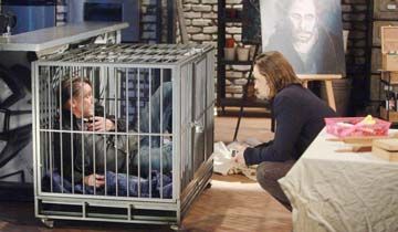 At Franco's art studio, Tom crouched, caged in a dog crate, as he pleaded to be released. Tom promised that he'd learned his lesson not to mess with Franco, but Franco clarified that Tom was there because of what Tom had done to Elizabeth. Franco knew Tom hadn't been rehabilitated in prison, so he intended to make certain that Tom never hurt Elizabeth -- or anyone else -- again. Tom argued that he'd paid his debt because he'd spent eighteen years in prison, but Franco explained that Tom had only paid a debt, not the one he owed for raping Elizabeth. Tom tried to put Franco on the defensive by throwing Franco's past crimes in his face, but Franco argued that he'd been sick. Tom scoffed and accused Franco of playing a sick game with him.