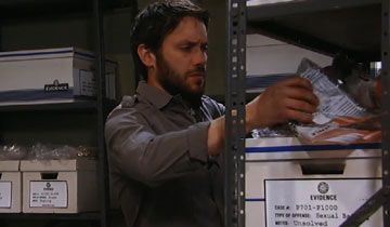 Scott shrugged and blamed it on a mix-up at the courthouse. After Scott left, Dante's phone rang. Dante had a short exchange with someone then ended the call and announced that the gunman's attorney had been detained at court. After the prisoner was returned to his jail cell, Dante decided to check the evidence room. He looked through the bags of evidence from the Floating Rib and found the bag with Morgan's prescription bottle.