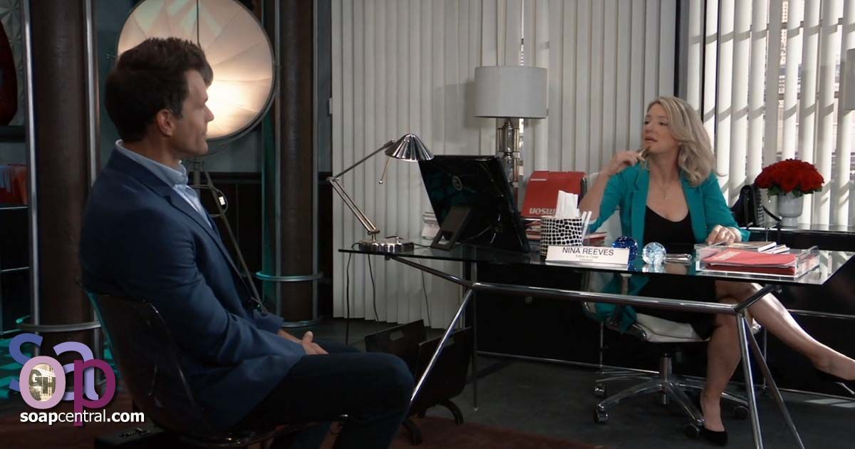 Nina said she hadn't expected anything less. Sonny smiled as he thanked her for her understanding. After Sonny left, Nina went back to work. As she ended a business call, she recalled Sasha's television appearance. Nina quickly turned on the television and leaned back to eat lunch, but she froze in horror when she saw what had unfolded on Home & Heart.
