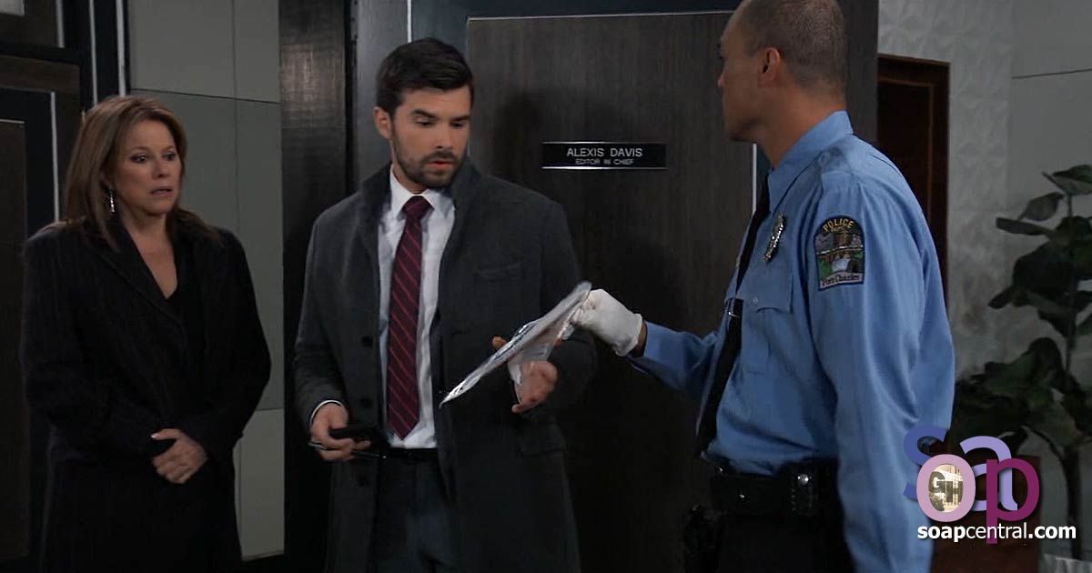 At the Invader, Chase asked Alexis some questions, and she wondered why Esme was the focus of the questions. Before he could answer, an officer approached with an evidence bag containing what looked like a letter. Chase also showed her the sculpture Esme had hit Kevin with and made sure she recognized it. He wondered if anything else had been disturbed, but Alexis couldn't know without looking through things. She wondered if Esme had attacked Kevin. Chase replied that Esme was the prime suspect, and he feared that she wouldn't stop with Kevin.