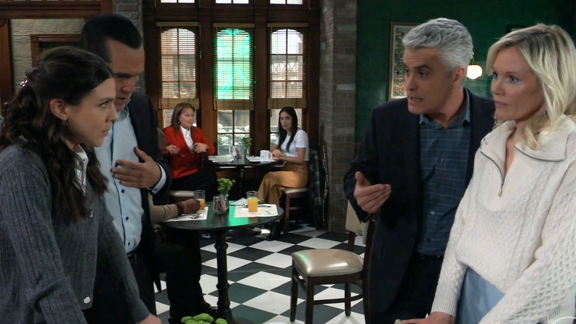 At Charlie's, Carly was incredulous as she watched Lucy (Lynn Herring) dine with Sidwell. She even told him off before Jack intervened. Trina was also there telling Stella all about her date with Kai.