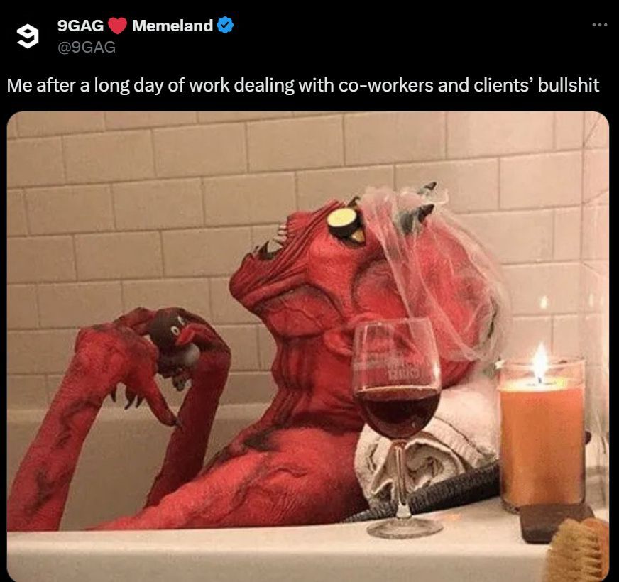 This meme shows a devil resting in his bathtub and playing with a toy. The tweet says this is how the user feels after a long tiring day of work.