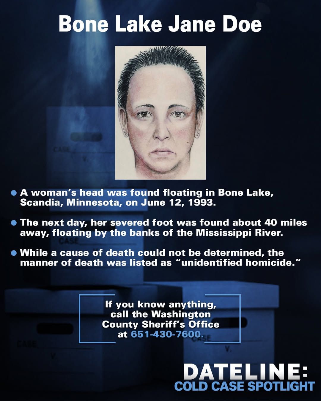 The next day, her foot was found about forty miles away at St. Paul, Minnesota. Dateline further presented the cold case as one that has remained unsolved for more than three decades, and despite DNA evidence and attempts to uncover the identity of Bone Lake Jane Doe through forensic DNA genealogy, the status of the case is still pending.