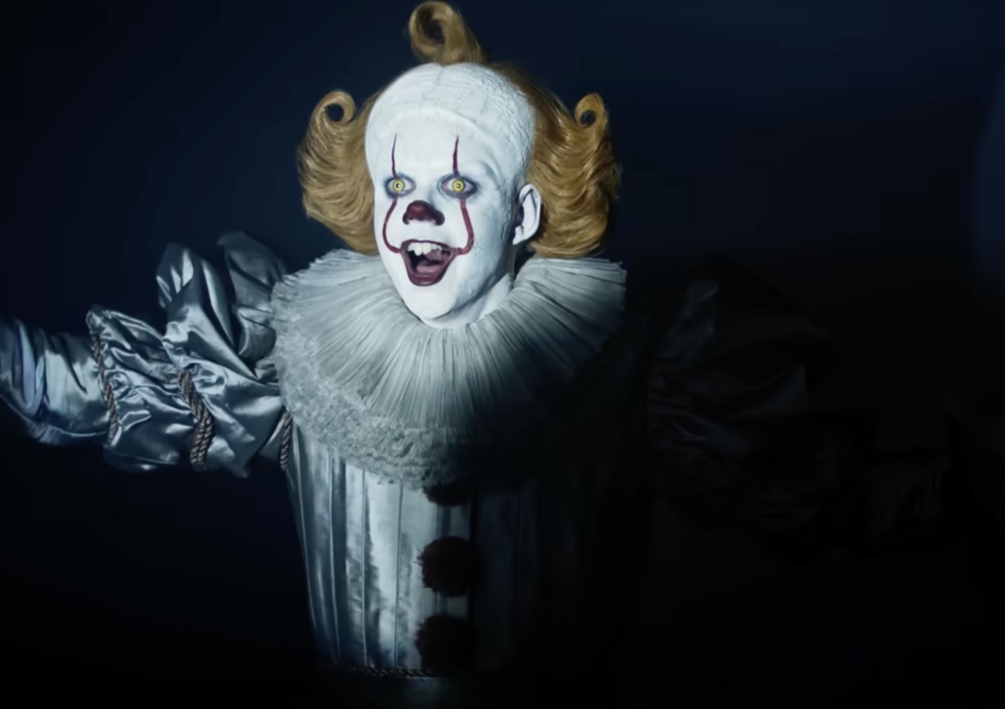 Sean Sansom, the prosthetic production head, mentioned how Bill had a face like a baby and eyes that were big, which were then managed by giving him a bigger skull, killer's teeth, and yellow eyes.