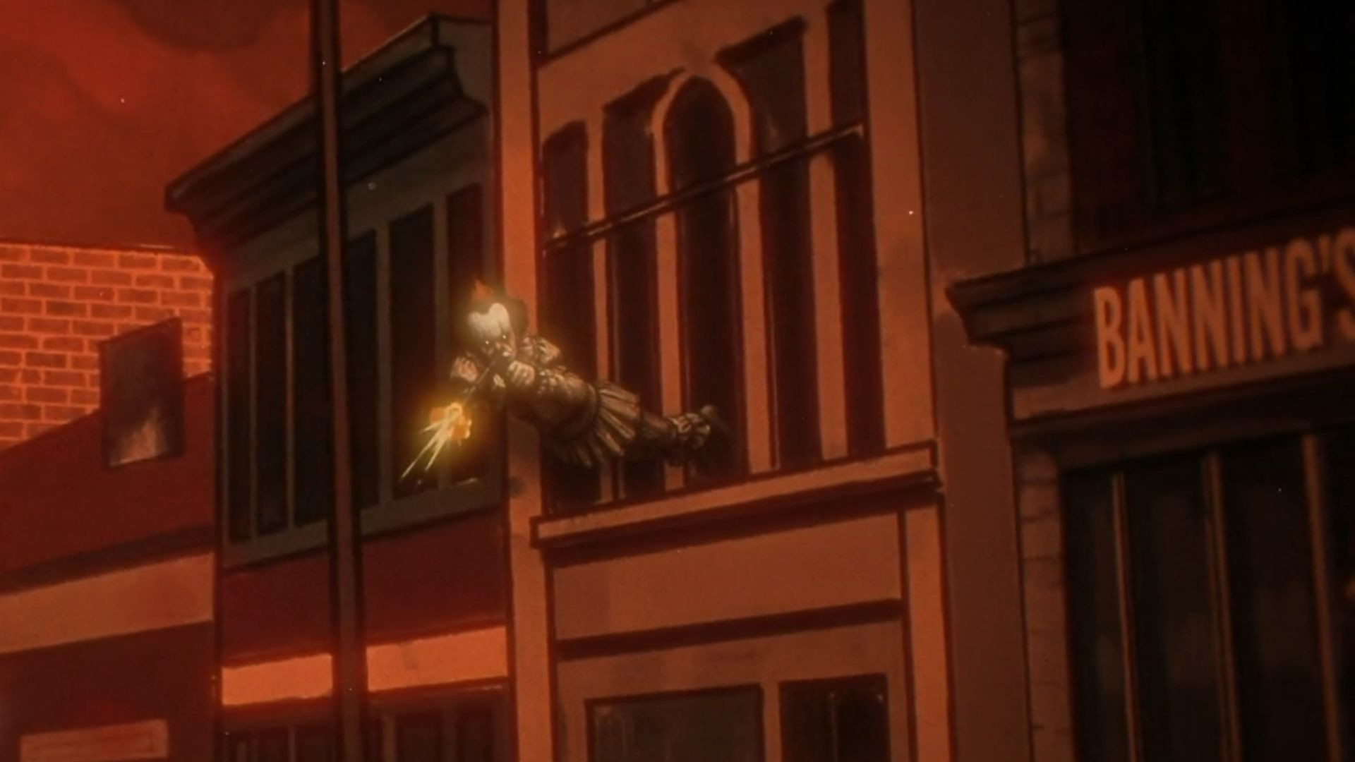 The opening credits of IT: Welcome to Derry Season 1 also softly confirm this direction. Around the one minute mark, the images show a bullet riddled car and blood soaked criminals. Pennywise is there too. He is seen leaning out and firing, floating exactly like the witness described in the book. IT: Welcome to Derry is not hiding the massacre. It is circling it.