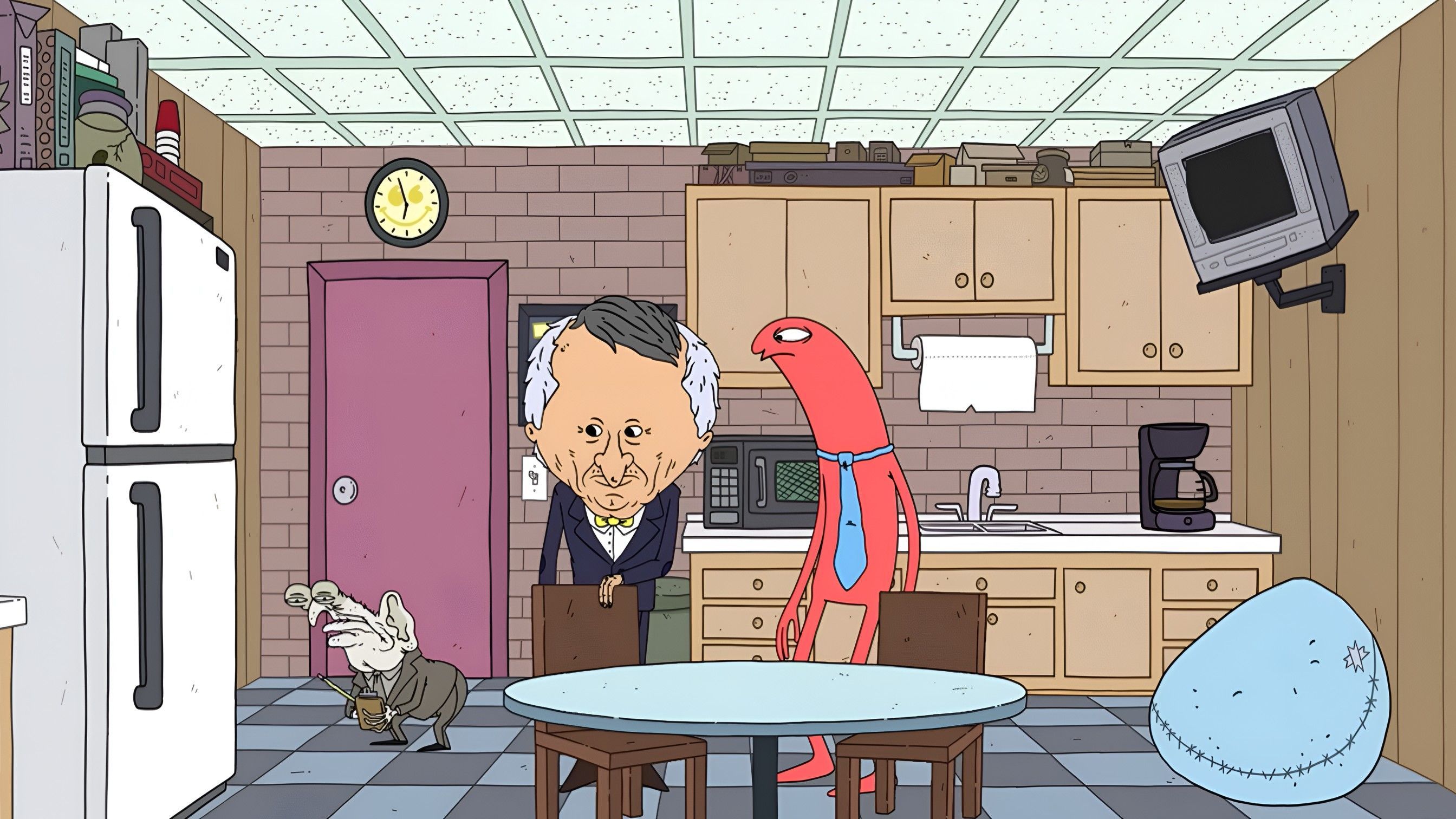Humor is not plotted but situational instead; it comes from Glep's deadpan reactions and the office's gradually more exasperated responses. This gives rise to a very typical Smiling Friends Season 3 episode, where overturning the absurdity is the main thing emphasized, while the story is kept short.
