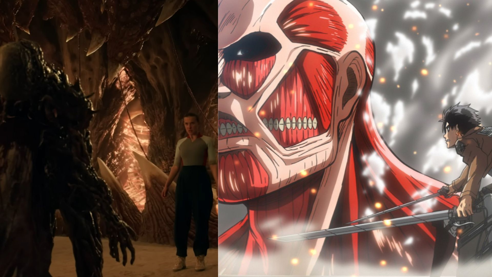 Stills from Stranger Things Season 5 & Attack on Titan (Image Via: Netflix & X/@AttackOnTitanEN)