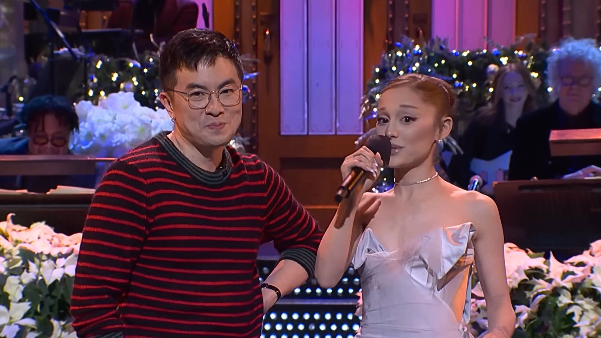 The trio then concluded the skit by singing "Please Come Home for Christmas,'' which made Grande visibly emotional and teary-eyed, as Bowen Yang spoke his final line on Saturday Night Live: