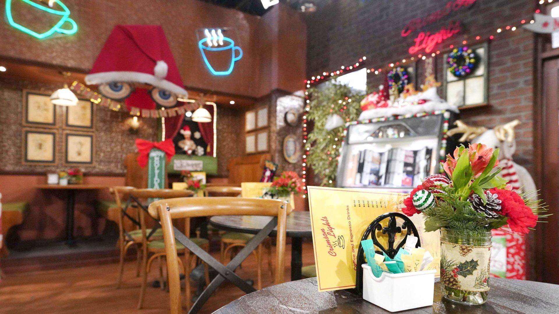 Sharon (Sharon Case) may be trying to banish the ghosts in her life, but her coffee shop has found the holiday spirit. Crimson Lights is looking extra festive despite the mood at home.