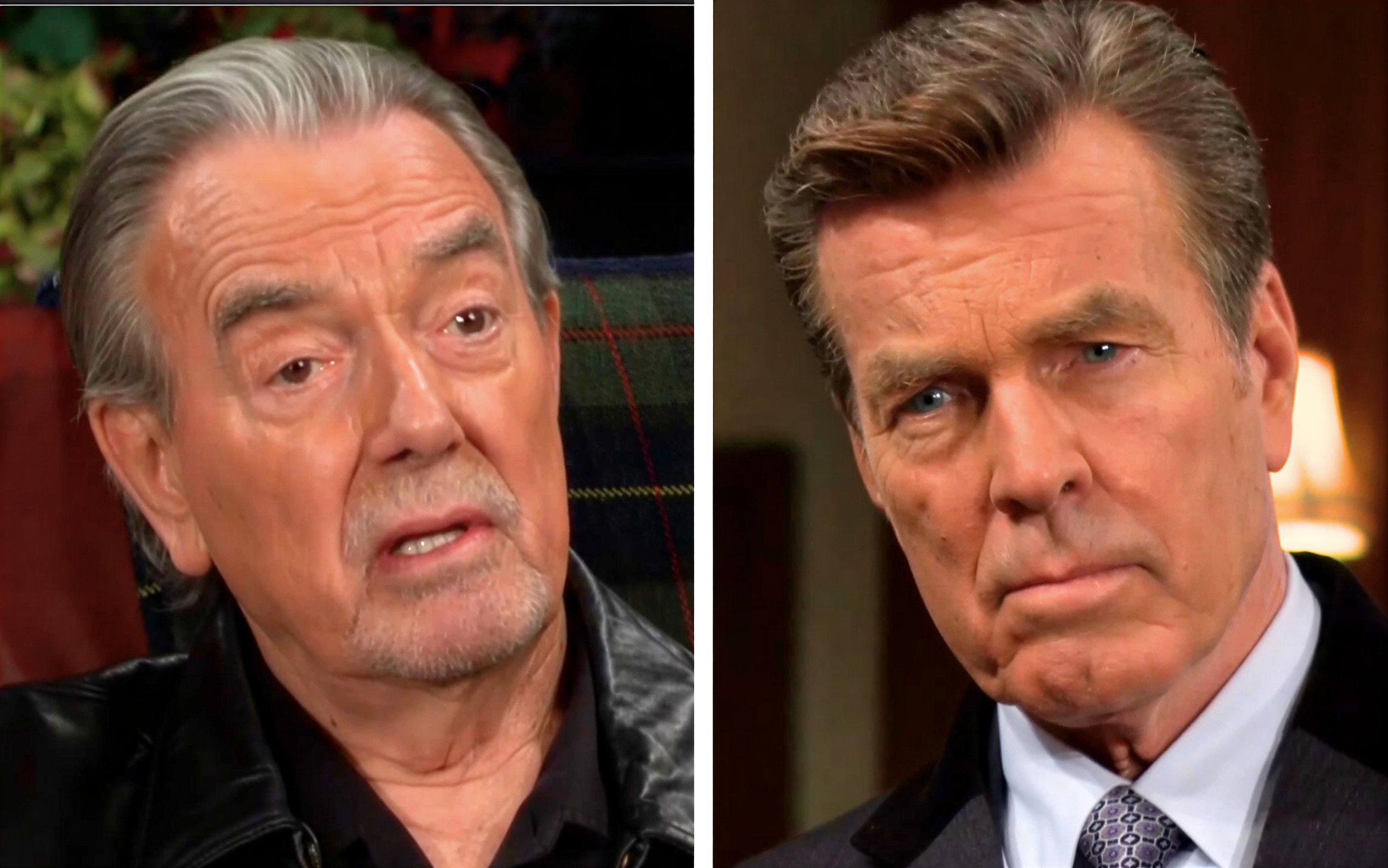 A split-screen image showing Victor Newman (Eric Braeden) on the left looking stunned and weary, and Jack Abbott (Peter Bergman) on the right with a stern, intense expression.